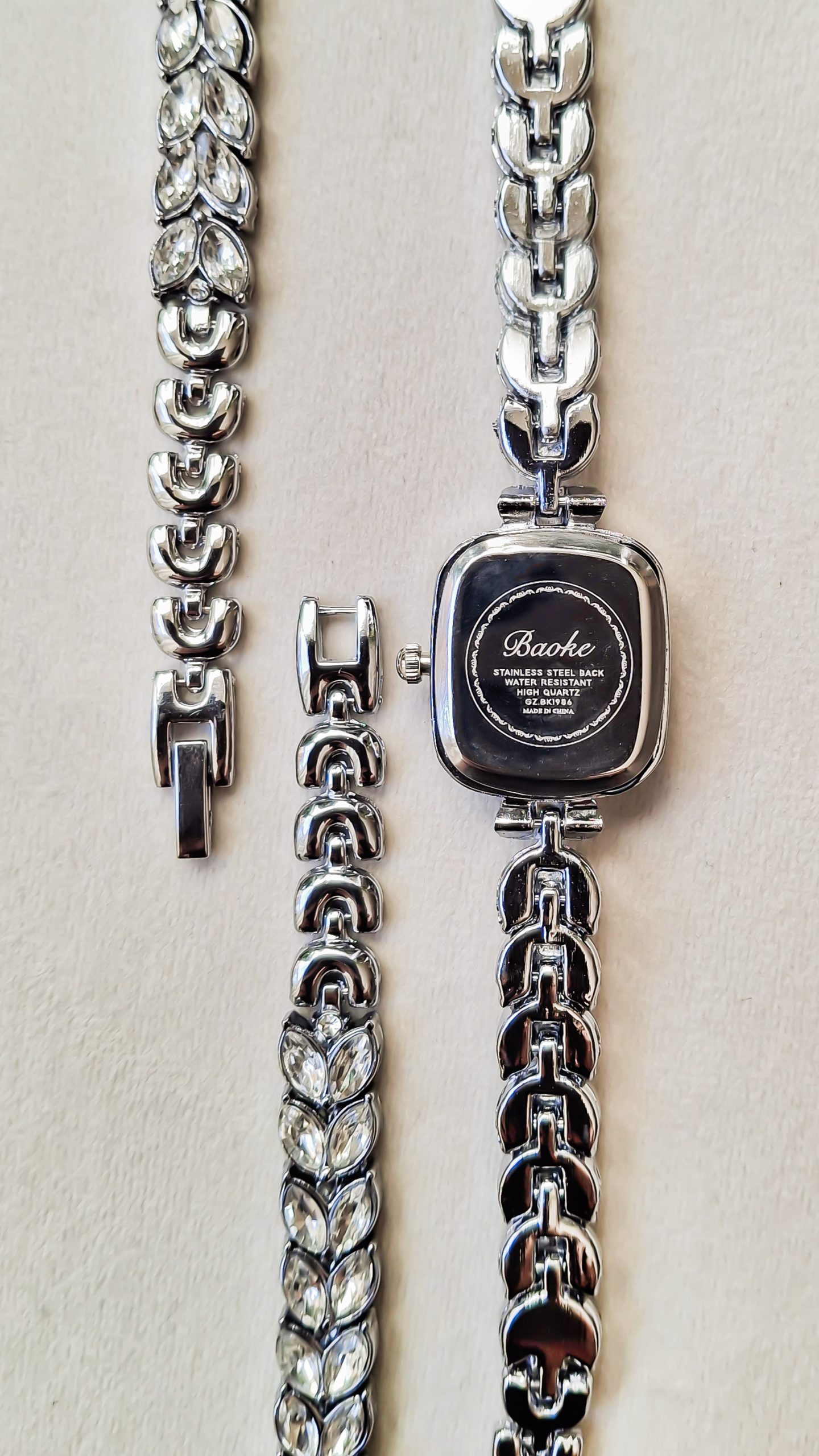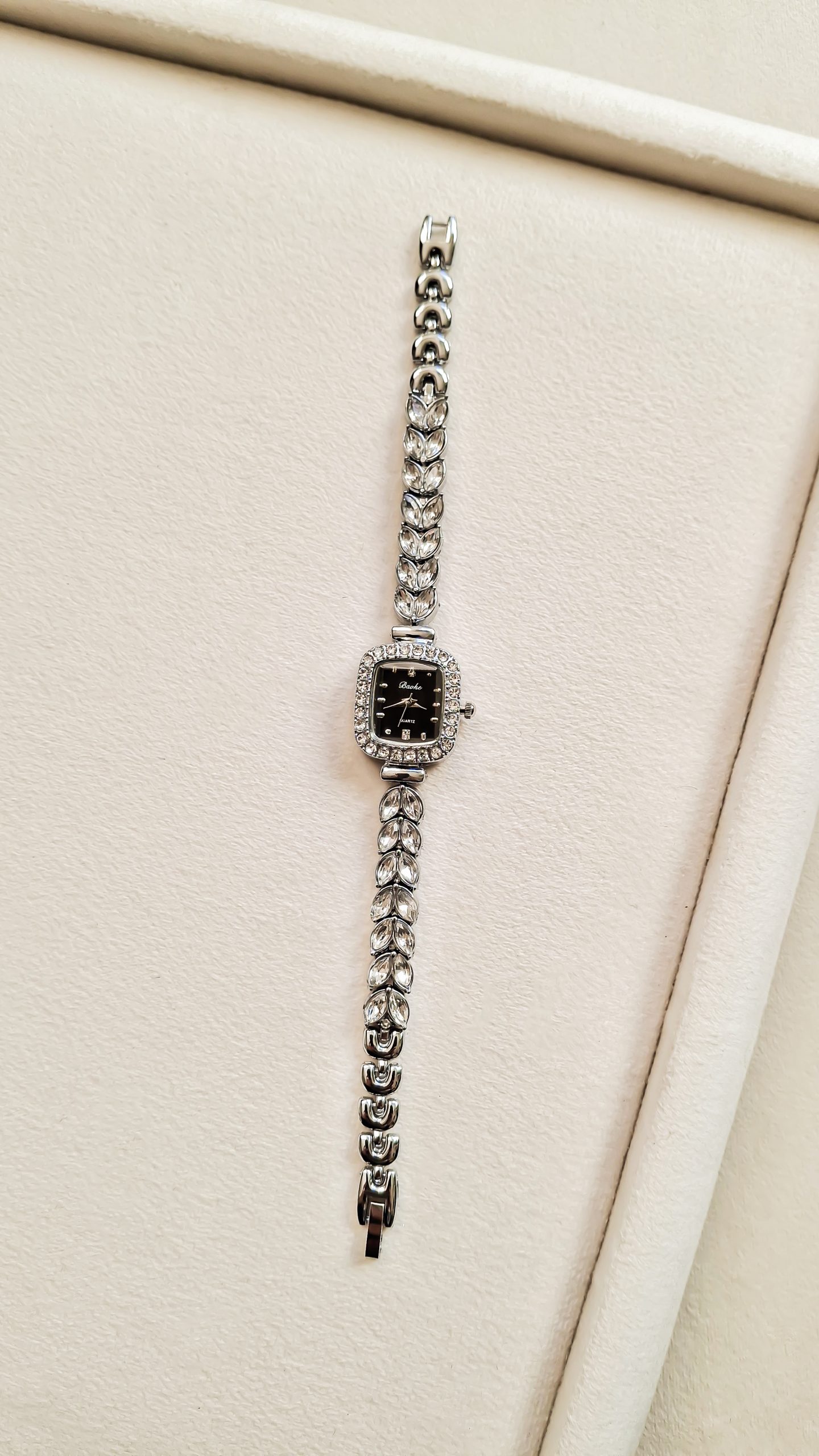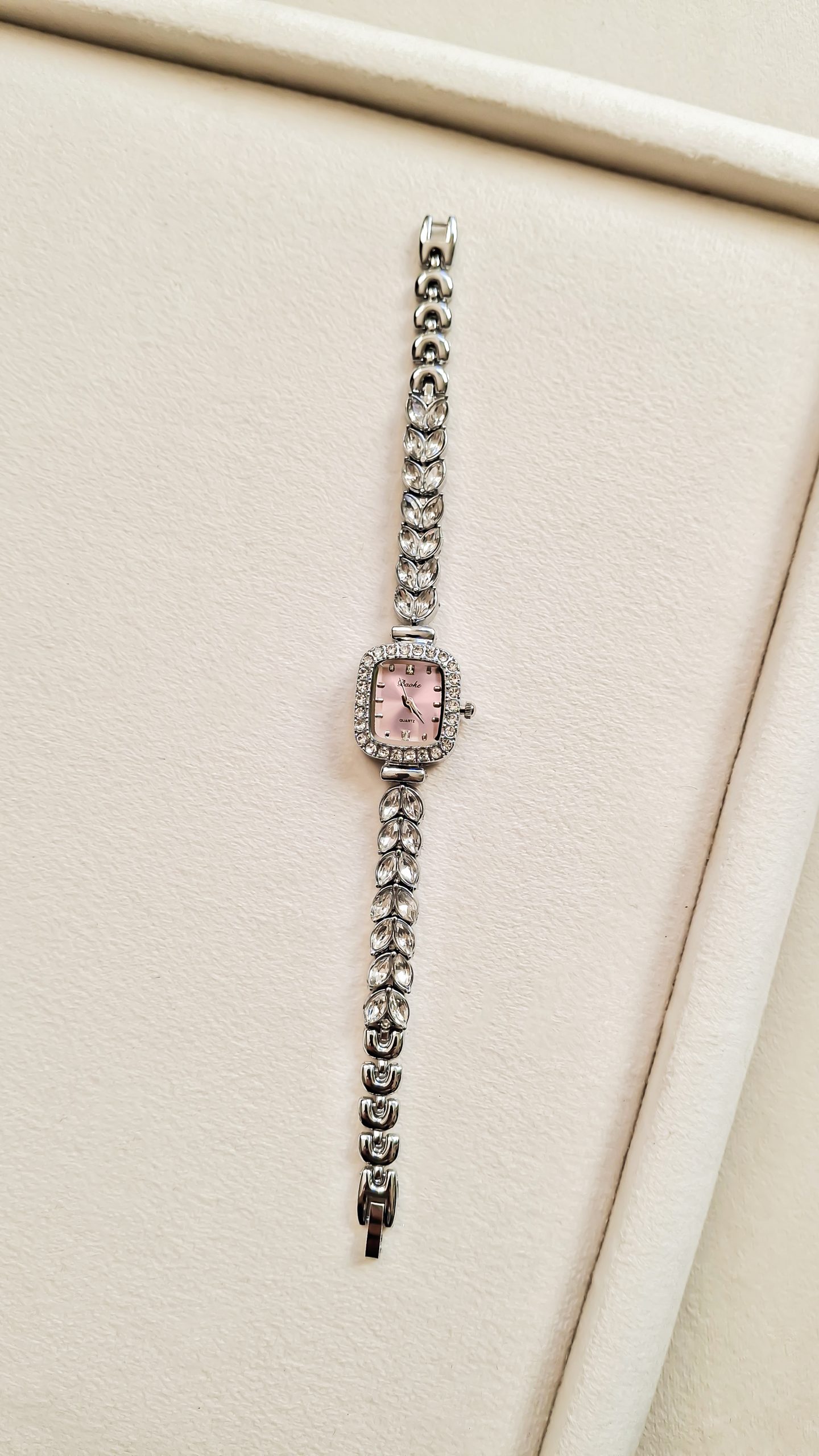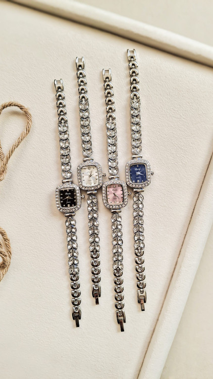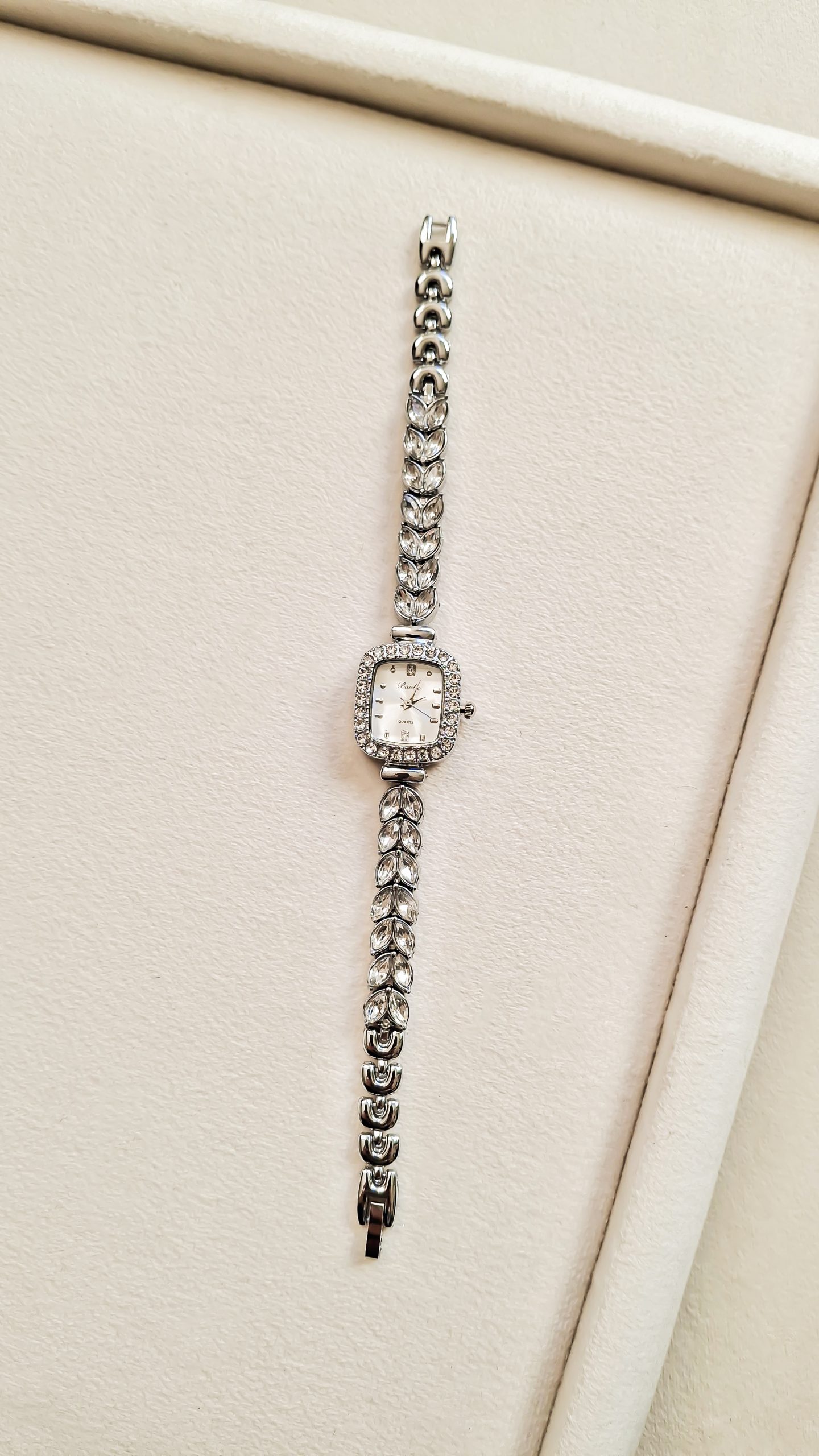 ساعت زنانه نگینی گندمی مربع بند سیلور